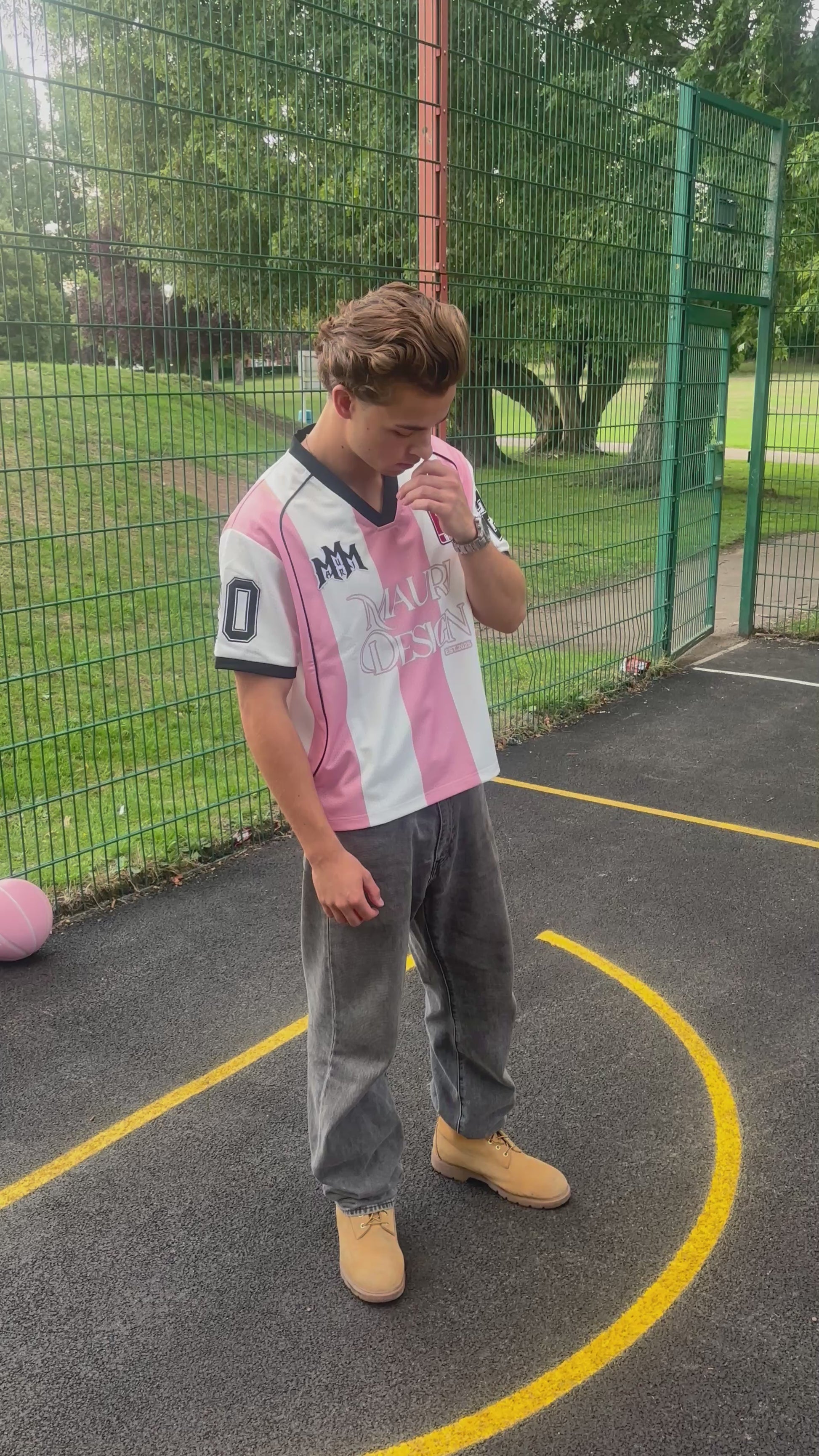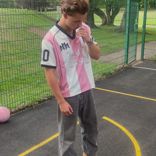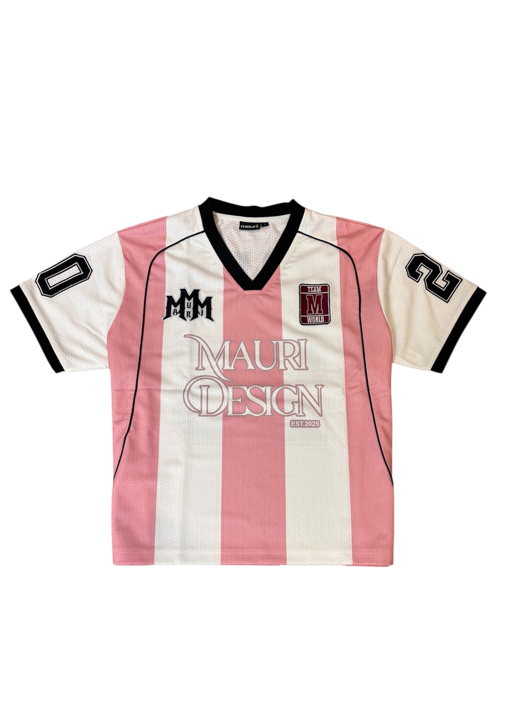 Step onto the scene in bold style with our heavyweight striped jersey. Crafted with premium breathable mesh fabric, this jersey blends streetwear aesthetics with athletic comfort. Featuring classic pink and white vertical stripes, embroidered details, and “Mauri Design” branding across the chest, it’s built to stand out.